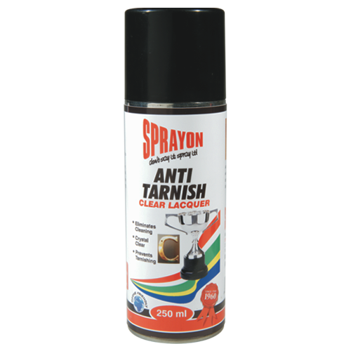 Anti-Tarnish Spray lacquer Spray Anti-Tarnish is a clear lacquer sealer which prevents tarnishing of brass, copper and silver and eliminates cleaning.Once treated the surface will remain clean and bright with a hard wearing finish.Available in 250ml cans. Dowload MSDS