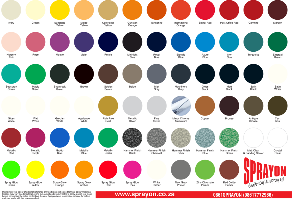 Sprayon is not responsible or liable for colour matches made with this reference chart.