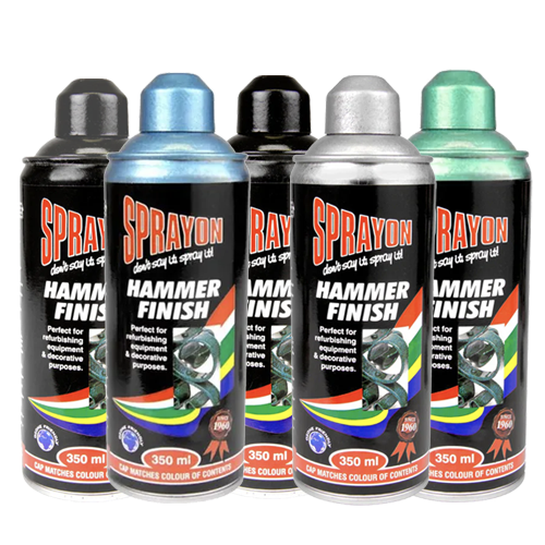 Sprayon Hammer Finish Lacquer Spray Paints Sprayon uses the same paint batch to colour code each cap ensuring an exact match to the can’s contents, your guarantee of satisfied customers. A speciality lacquer spray from Sprayon which gives a sprayed ‘Hammered’ look.A very hard, durable finish that is perfect for refurbishing equipment and for decorative purposes.Hammer Finish is available in 5 standard colours and in 350ml cans. Dowload MSDS SPRAYON HAMMER FINISH COLOUR CHART Hammer Finish Black Hammer Finish Charcoal Hammer Finish Green Hammer Finish Blue Hammer Finish Silver